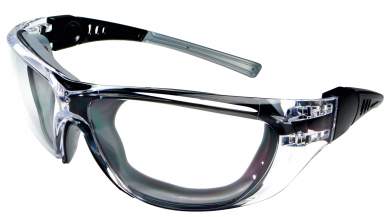 Neuentwicklung einer Schutzbrille, die einen Rundumschutz durch Kombination aus Bügel- und Vollsichtbrille bietet. Diese Brille kann entweder als reine Bügelbrille getragen werden oder in Verbindung mit den einsetzbaren Körben und dem Kopfhalteband als Vollsichtbrille zum Rundumschutz für die Augen verwendet werden.